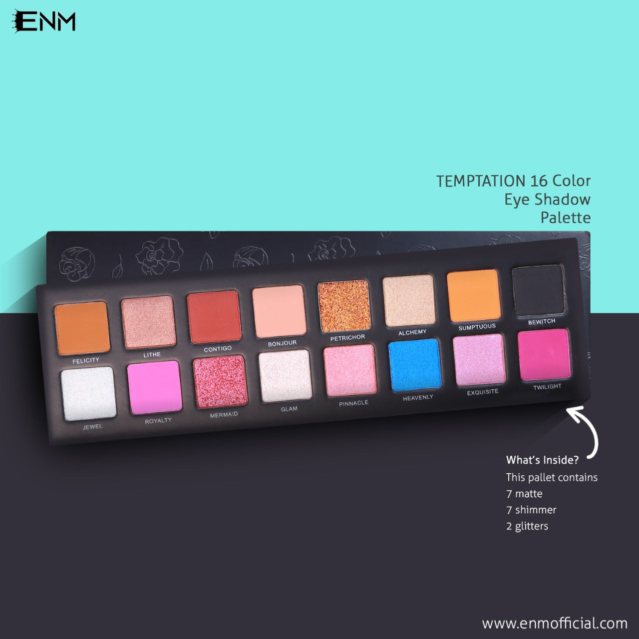 This eye shadow pallet contain: 7 Matte, 7 shimmers and 2 glitters
